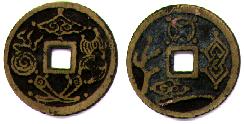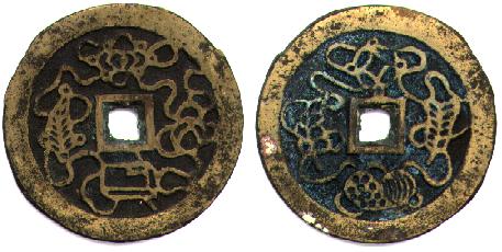 Obv.: | Top:A gold cash, Bottom: Spectre Right: fang sheng Left: Coral branch |