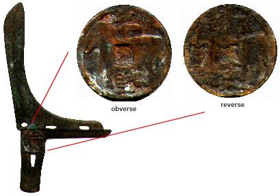 Round images on the halberd imitates two of Ta Ma Ch'ien or 'Great Horse Coins'. These pieces [round horse charms] showing famous horses were used as gaming counters and have been worn as amulets. [R]