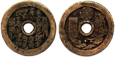 Rev.: | Top: Eight Trigrams Bottom: Waves, another item with Snake and Turtle, Right: A figure, perhaps a fisherman Left: ? |